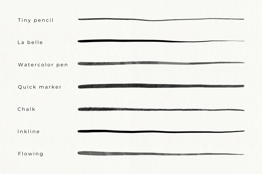 ✔ 14 Custom Brushes – A refined mix of calligraphy pens, smooth liners, textured chalk, and expressive brush pens.